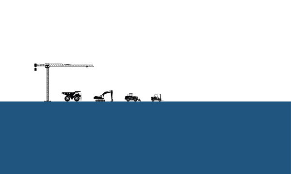 Dunkelblaue Fläche, die auf der Hälfte des Drucks mit Silhouetten verschiedener Baufahrzeuge verläuft.