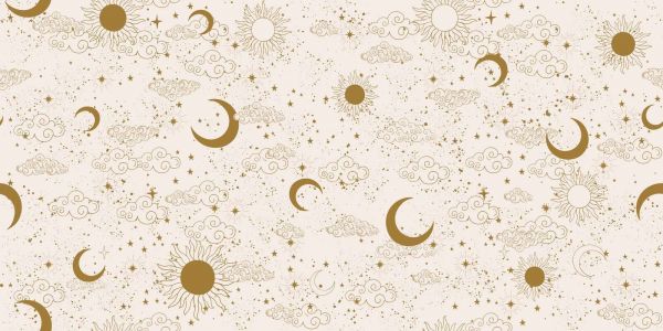 Ein luftiges, himmlisches Bildnis aus anmutigen Sonnen, Mondsicheln, Sternen und schwungvollen Wolken in Gold auf einem zarten cremefarbenen Hintergrund. Das Ganze vermittelt Ruhe, Magie und raffinierte Eleganz.
