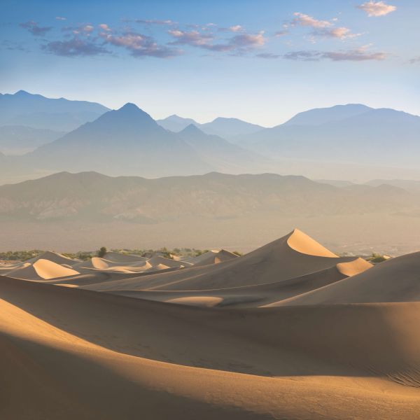 Der Sonnenaufgang im Death Valley National Park, Kalifornien. In der Ferne kann man die Berge sehen, was einen einzigartigen Effekt erzeugt.