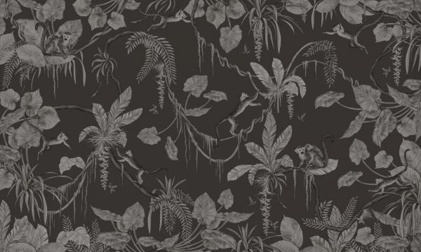 Dieses faszinierende Design fängt das Gefühl eines tropischen Regenwaldes bei Nacht ein. Auf einem tief schwarzen Hintergrund spielt sich ein Dschungelleben in raffinierten Grautönen ab, in dem Affen sich anmutig zwischen üppigen Blättern, schwingenden Lianen und blühenden Helikonien bewegen. Der monochrome Stil verstärkt den geheimnisvollen Charakter des Designs: Es ist reich an Details, bleibt aber zurückhaltend und stilvoll. Die Affen bringen Dynamik ins Gesamtbild - sie schwingen, ruhen und erkunden das Blätterdach, während zwischen den Ästen auch tropische Vögel und Schmetterlinge auftauchen, subtil in das Liniengefüge eingearbeitet. Perfekt für ein modernes, schickes oder luxuriöses botanisches Interieur, in dem tiefe Farben, Textur und Kontrast zusammenkommen. Kombinieren Sie dieses Design mit Samtstoffen, dunklen Hölzern, Messingakzenten oder Naturstein, um einen raffinierten, stimmungsvollen Raum zu schaffen. Dieses Design kommt besonders gut als Akzentwand in einem Wohnzimmer, Schlafzimmer oder stilvollen Büro zur Geltung. Auch in einem charaktervollen Restaurant oder Hotelzimmer setzt es ein kraftvolles, aber beruhigendes Statement. Der dunkle Hintergrund sorgt für eine intime, fast theatralische Atmosphäre, die umhüllt und anregt. Für diejenigen, die ein gewagtes Design mit natürlicher Eleganz lieben, ist dies eine einzigartige Wahl: Dschungel, aber mit einem erwachsenen, raffinierten Twist. Ein visuelles Stillleben, das fasziniert.