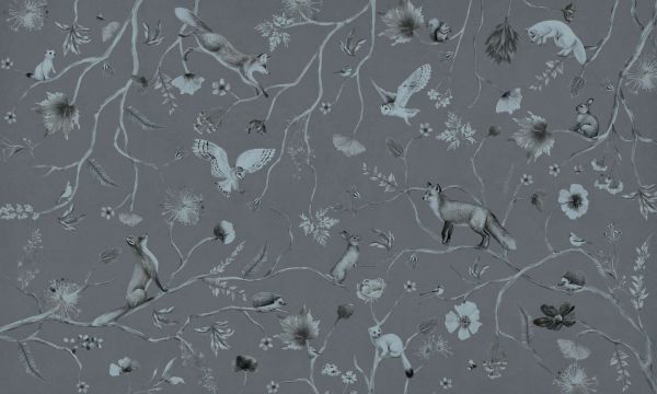 Füchse, Eulen und Igel bewegen sich leise zwischen anmutigen Zweigen und Blumen auf einem graugrünen Hintergrund. Die sanften Kontraste und kühlen Farbtöne schaffen eine ruhige, geheimnisvolle Atmosphäre voll natürlicher Eleganz.