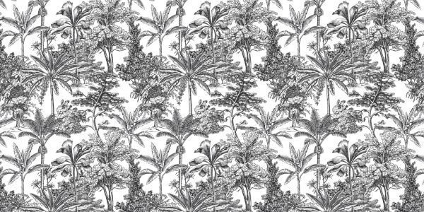 Gezeichnete tropische Bäume in schwarz und weiß mit u.a. Palmen und Bananenbäumen.