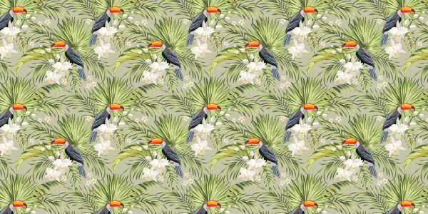 Tropisches Muster aus Blumen, Tukanen und Blättern.