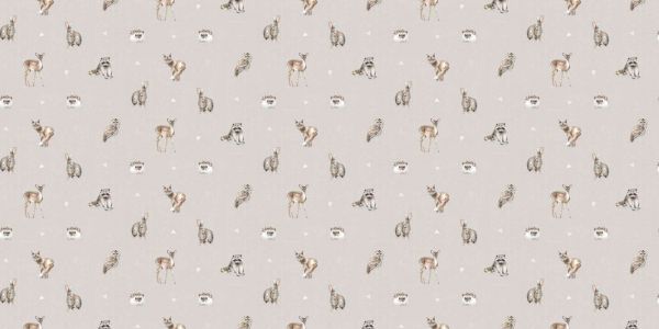 Ein verspieltes Muster mit Hirschen, Eulen, Igeln, Kaninchen und Waschbären auf einem weichen taupefarbenen Hintergrund. Die Tiere sind subtil in natürlichen Brauntönen gezeichnet, was für ein beruhigendes und freundliches Gesamtbild sorgt.