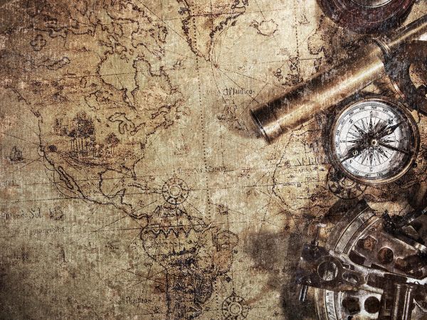 Weltkarte mit Kompass. Die Karte hat ein antikes Aussehen und ist ein Blickfang in jeder Wohnung.