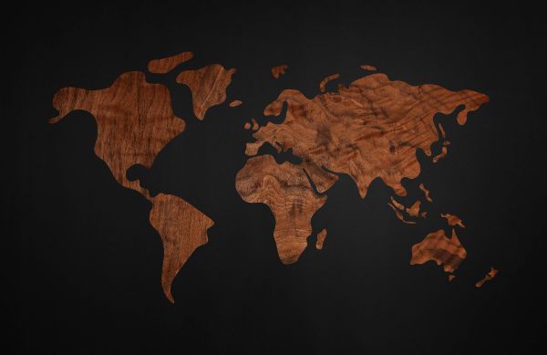 Schöne Weltkarte aus Holzfurnier. Durch den schwarzen Hintergrund kommt die Weltkarte besonders gut zur Geltung.