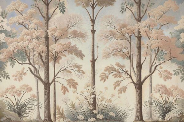 Dieses Bild zeigt eine serene Waldlandschaft, in der hohe, schlanke Bäume im Mittelpunkt stehen, umgeben von sanften Blüten, feinem Laub und eleganter Untervegetation. Die Bäume sind elegant ausgestaltet mit subtilen Rindenstrukturen und luftigen Kronen, wodurch die Landschaft offen und licht wirkt. Die Farbpalette besteht aus warmen Creme-, Sand- und Beigetönen, ergänzt durch graugrünes und einen Hauch von Pastellblau im Hintergrund, was zusammen eine harmonische und ruhige Ausstrahlung erzeugt. Der illustrative Stil hat eine klassische und verfeinerte Ausstrahlung, vergleichbar mit historischen Landschafts- und Naturstichen. Durch die weichen Übergänge und das Fehlen harter Kontraste entsteht ein ruhiges und ausgewogenes Ganzes. Das macht die Landschaft besonders geeignet für eine modern-klassische oder ländliche Einrichtung, in der sie Wärme und Ruhe hinzufügt, ohne dominant zu sein. In Kombination mit Holzmöbeln, natürlichen Stoffen und hellen Farben entsteht eine zeitlose und einladende Atmosphäre. Auch in einem skandinavischen oder Japandi-Wohnstil kommt dieses Waldlandschaft schön zur Geltung. Die natürlichen Formen und zurückhaltenden Farben fügen sich nahtlos in Innenräume ein, in denen Einfachheit, Balance und Natur im Mittelpunkt stehen. Denken Sie an Kombinationen mit hellem Holz, Leinenstoffen, Keramik und minimalistischen Accessoires, die den ruhigen Charakter stärken. Dieses Design ist vielseitig einsetzbar und passt ausgezeichnet in Räume wie Wohnzimmer, Schlafzimmer oder ruhige Arbeitsbereiche. In einem Schlafzimmer trägt es zu einer entspannten und behaglichen Atmosphäre bei, während es in einem Wohnzimmer eine sanfte, natürliche Grundlage bildet, die Ruhe ins Interieur bringt. Die Kombination aus einer verfeinerten Waldlandschaft, sanften Blüten und einer zurückhaltenden Farbpalette macht dieses Bild zeitlos, elegant und breit einsetzbar in unterschiedlichen Einrichtungsstilen.